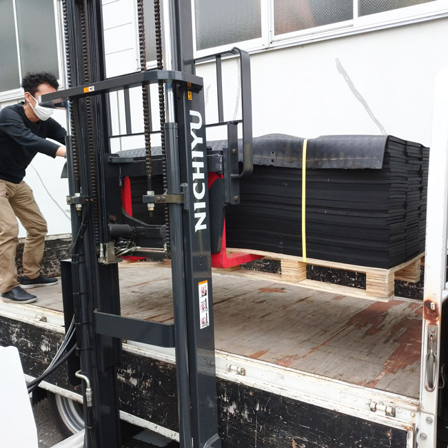 ▽ PPバンドで固定をして、慎重にトラックに積みます。