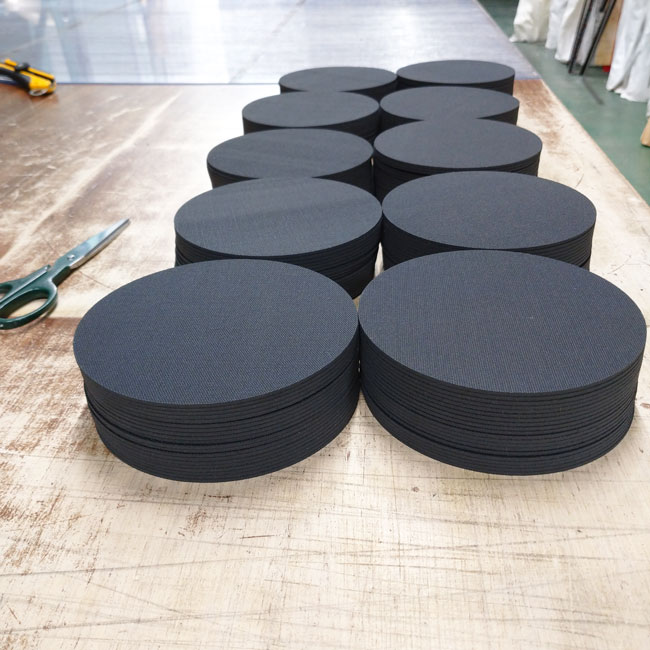 ゴムシートを円形にカットするご依頼をたくさんいただきます。1枚のご注文から数100枚のご依頼まで様々です。円の直径サイズやその他の細かな条件にもよりますが、早ければ当日出荷、通常は1~2日以内、遅くても3~4日以内には出荷することができます。量産前のテストカットなどもお気軽にご連絡くださいませ。