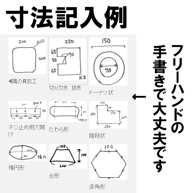 メモ書きで形状と寸法を書いていただいて、スマホで撮影して送っていただくことで御見積回答させていただきます。材質や厚みで迷われているときは通常のお見積り依頼と同じく、決めかねておられることとご用途を詳細に書いていただければこちらからご提案をさせていただきますのでご安心ください。