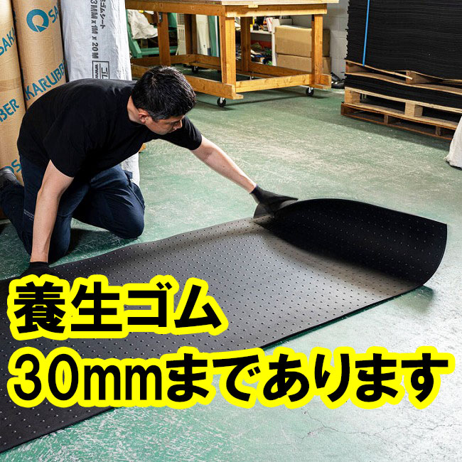商品の特徴として、表面が若干ですがザラザラしていることに加え、片面にイボイボがついていますので、滑り止め効果に優れています。また平方メートル単価は最も安価で養生ゴムとしての要件を満たしている材質と言えます。