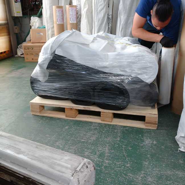 宅配でお届けできない重量(50kg以上が目安)のゴムシートはパレットでお届けいたします。パレットはフォークリフトで持ち運びしますため、荷崩れが起きると大事故につながります。ですので、当り前のことかもしれませんが、パレットの荷造りは安全第一で荷物を固定しております。基本はPPバンドと梱包用ラップを使った荷造りです。カンタンに荷崩れしませんが、ハサミやカッターがあれば荷解きが出来ますので、お届け後もすぐに開梱ができます。