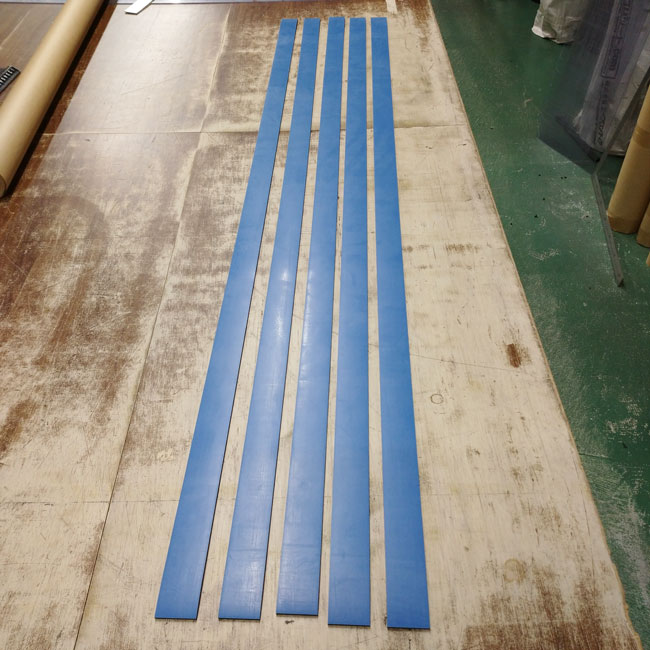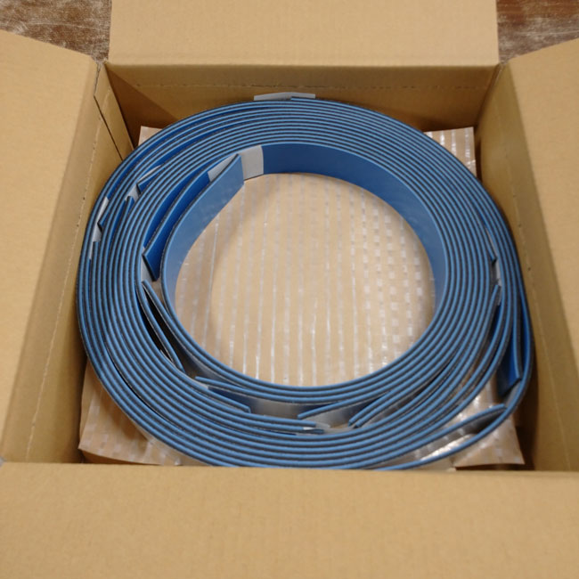 カラーゴムは緑、赤、青、黄、茶の5色を扱っています。イベント会場やショッピングセンターなどでも雰囲気が暗くなりにくいので使いやすいです。また、色による明確な区分ができたり、注意喚起にもなりますので、床面や壁面に貼り付けて目印に使っていただくことが多いです。今日は貼り付け用の両面テープを付けた事例です。翌日出荷させていただきました。