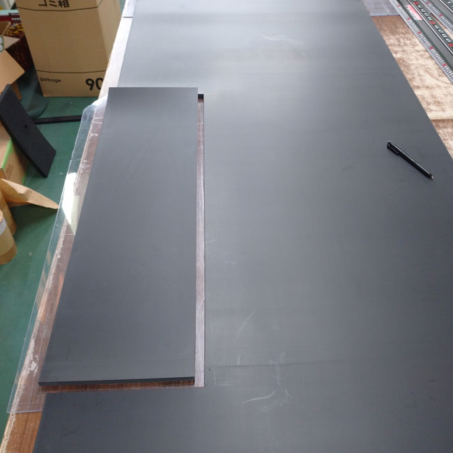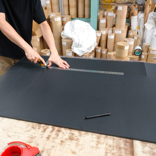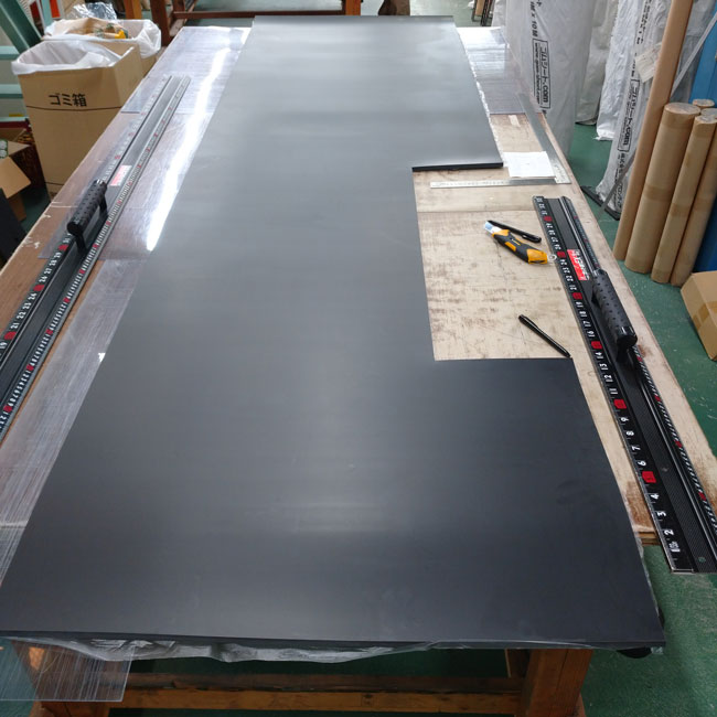 ゴムマットを敷き物といてお使いの場合、柱やタイヤハウスなどを避けて敷かないといけませんよね。現場でカットすることもできますが、大きなゴムのカットは思ったよりも大変なのです。重いゴムを持ち運ぶ、広げる、まっすぐ切るなど想像以上の手間と時間がかかります。。現場は時間との勝負という側面もあるかと思いますので、事前に寸法をお知らいただければその通りにカットしてお届けすることも出来ます。大きなサイズは機械に載せられないので手加工になりますが、ゴムの扱いに慣れた私たちがきっちりお仕事をさせていただきます。