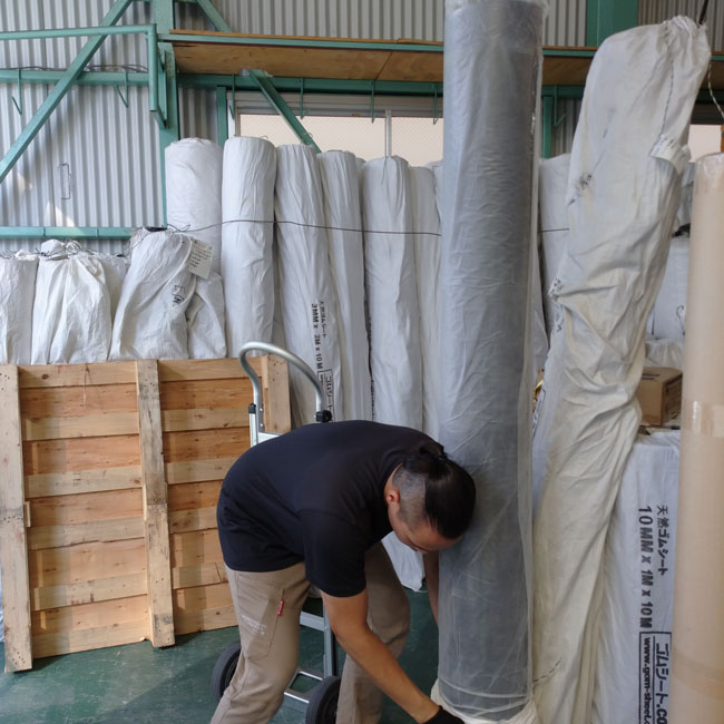 ゴムシート.comでは最大で幅2Mのゴムシートを取り扱っています。在庫品ですので、即納可能です。超幅広は超重量級で、梱包サイズも超特大です。通常幅1Mと比較しますと、単純に2倍の重量で2倍の大きさです。しかし、2M幅を選べる材質と厚みは限られていますが、広い面積を継ぎ目少なく敷き詰められる利点は通常サイズでは得られない大きな利点です。分割してもよいところは通常幅で、分割したくないところは2M幅で、というような使い分けをオススメしています。
