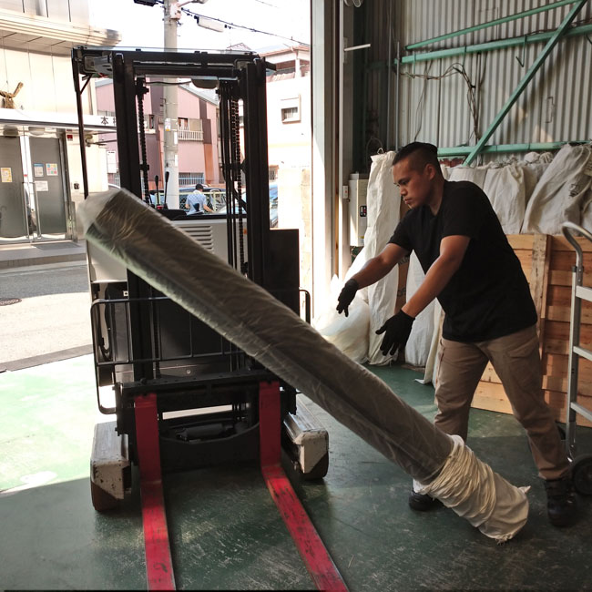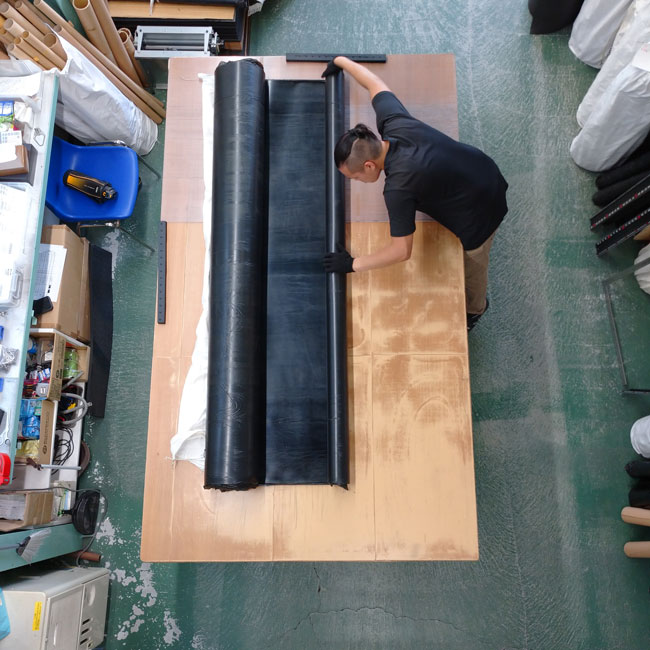 ▽ 作業台に広げました。スタッフと比較してそのサイズの大きさを認識していただけるかと思います。