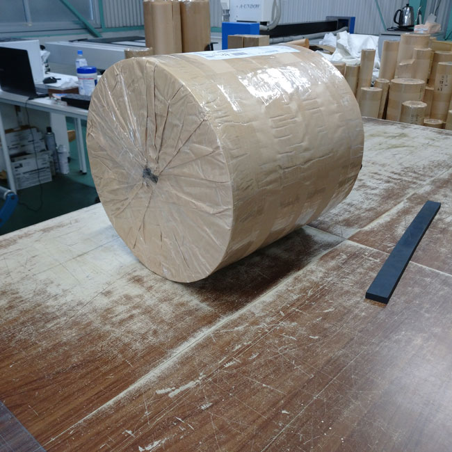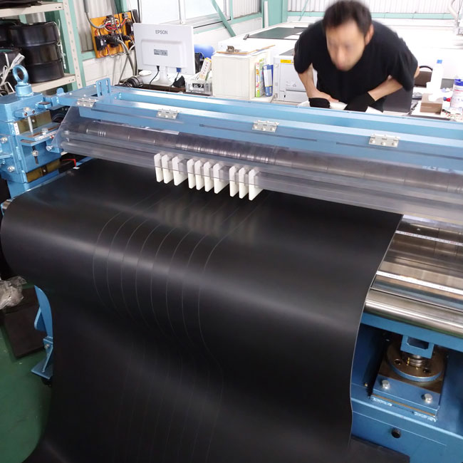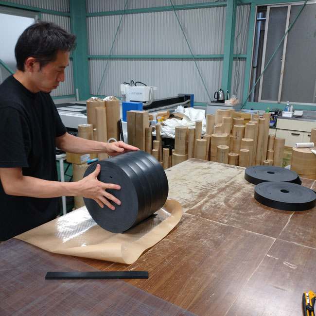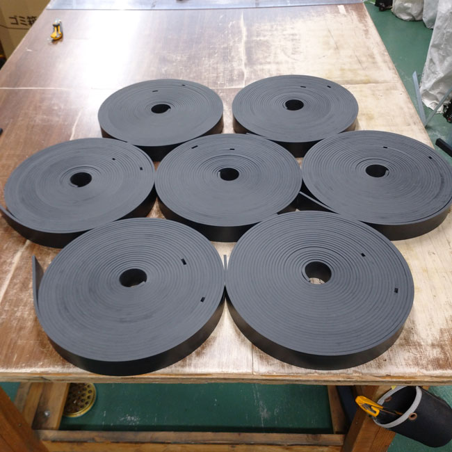 何度もご紹介させていただいてますが、ゴムシート.comではゴムシートの幅をご指定寸法にカットすることができます。お客様の現場でもカッターナイフがあればカットできますが、長尺のゴムシートですと、幅カット刃想像以上に大変な作業なのです。予め決まった幅寸法で納品させていただくと、すぐに使えるので便利です。労力と作業時間を考えると幅カット工賃はきっとお得だと思います。