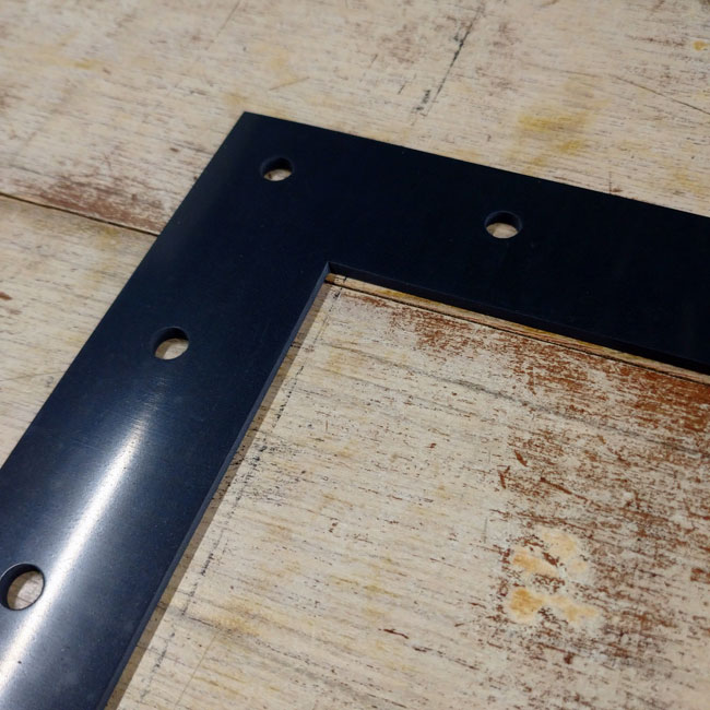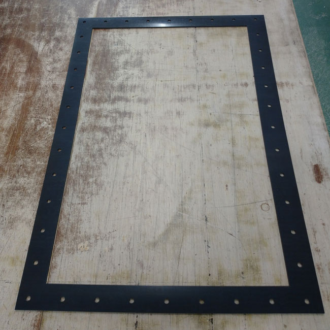角型+中抜き+穴あけのパッキン形状にオーダーカットした事例です。「額縁」などと言いますが、このような形状のカットも非常に多くご依頼いただきます。ご注文は1枚から承ります。カッティングマシンを使ってご指定形状にカットいたしますので、抜型代金が不要で抜型を制作する期間もありません。そのため短納期のご依頼にも柔軟にお応えできます。数枚のご注文でしたら当日出荷できることもあります。お急ぎの場合はお困りの現場からでもご連絡くださいませ。