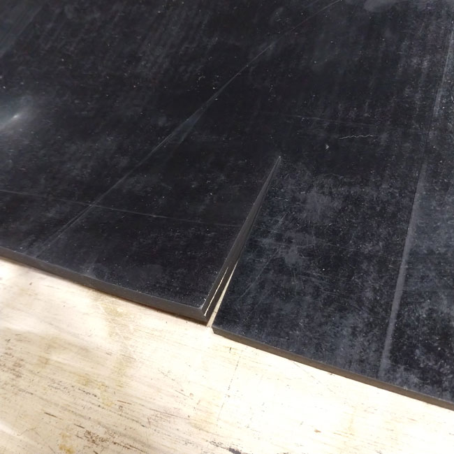 ゴムシートを切断するだけではなく、切り込みを入れることも出来ます。他の部材を差し込むなどする際に切り込みがあると非常に便利です。現場で切り込みを入れることも出来ると思うのですが、忙しい現場ではそのような時間も惜しいと思いますので、切り込みのオーダーカットをぜひご依頼ください。