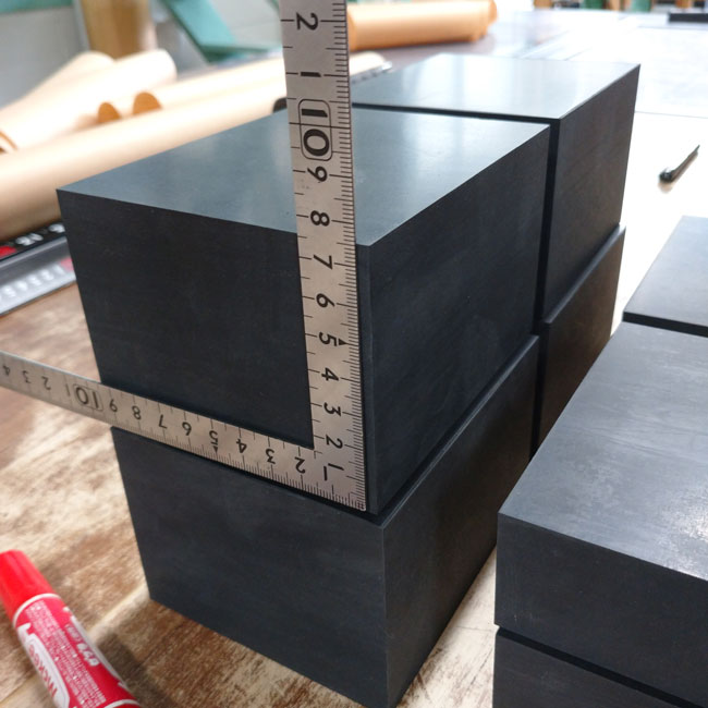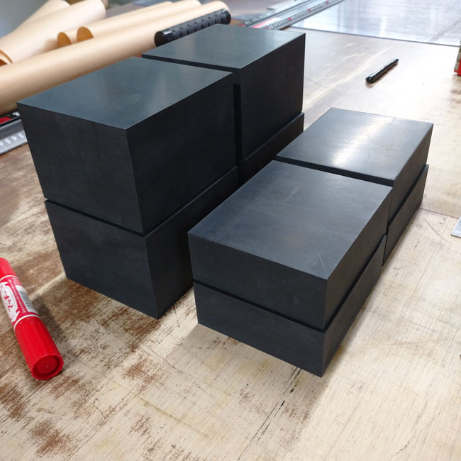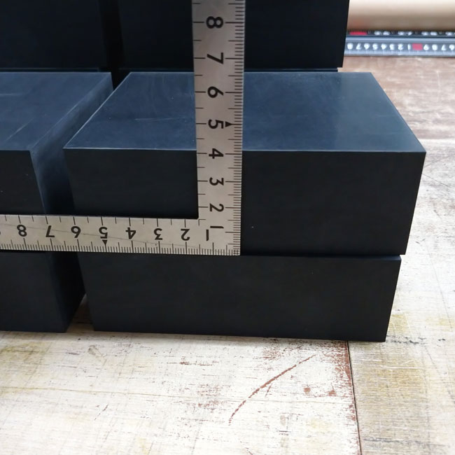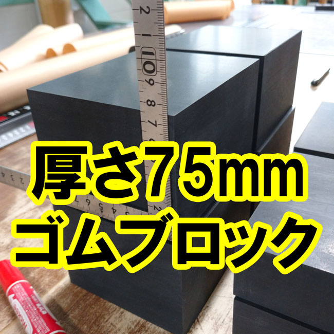 昨日の30mmに続いて厚物の記事です。今日は75mm厚の極厚ゴムブロックです。この厚みは取り寄せになりますので、即納は難しいです。段差解消としての使い方ではなく、嵩上げ(底上げ)に使われることがほとんどです。縦×横の寸法も自由にご指定いただけますので、その現場に応じた嵩上げ材を特注でご依頼いただけます。