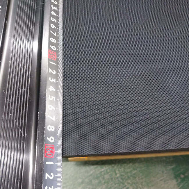 特に2トントラックの1600mm×3100mmがもっとも人気で、天然ゴム両面エンボス厚さ5mm×1600mm×3100mmをご注文いただきます。エンボスで滑り止め効果が高く、規格幅1600mmがあるため幅カットの必要がありません。(カット工賃不要)