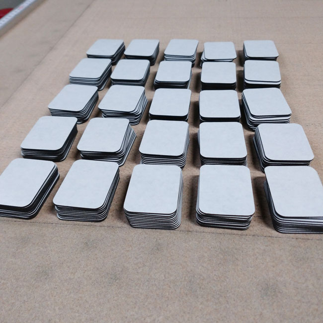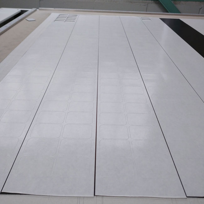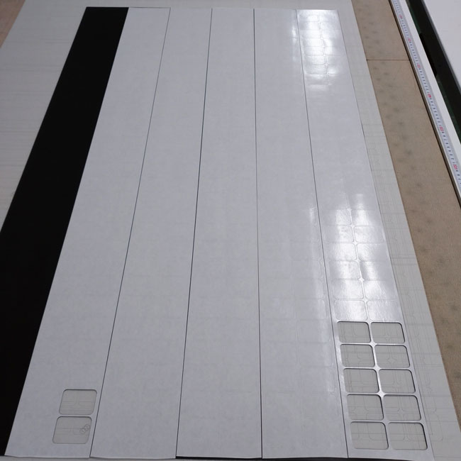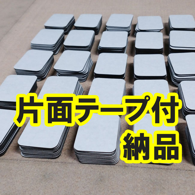 何度もご紹介していますが、両面テープをつけてカットした事例です。今回のカットは四角にRをつけています。長方形の4つの角が丸くなっているのが分かるでしょうか。カットをした後にテープをつけるとテープがはみ出したり足りなかったりときれいに貼り付けられませんので、テープを貼ってからカットをしています。テープに無駄が生じますが、仕上がりが美しくなります。