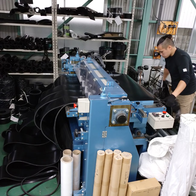 ゴムシートをご指定寸法で幅カットしている様子