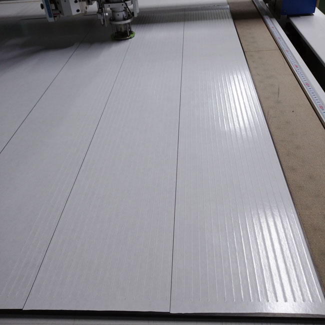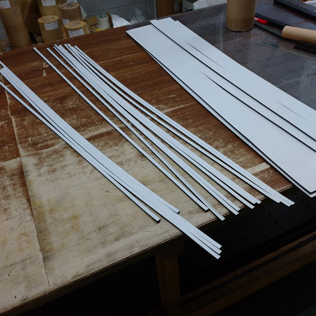 前述の機械でカットすることで寸法精度を高められます。しかし、その機械でカットできる最大寸法が決まっています。盤面サイズが決まっているからです。加工最大範囲は1300mm×2000mmです。これを超えるとこの機械は使えません。例えば、10mm幅で100M分必要な場合には、10mm×2000mmを50本としていただく必要があります。どうしても長尺で必要と言う場合には別の方法でカットすることになりますが、寸法精度は落ちてしまいますし、場合によってはカットが出来ない場合もございます。