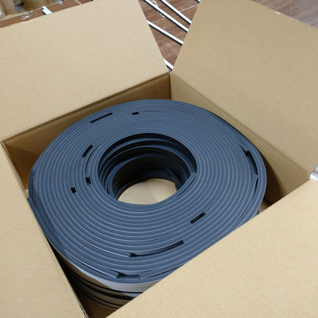 厚みと同程度の幅にカットすることも可能です。今回はテープ付きで細幅にカットした事例をご紹介します。手加工や幅カットの機械では寸法のブレがあるため、パソコンで図面を描いて、パソコンとつながった機械で図面通りにカットしました。ゴムを機械の盤面に吸着しながらカットするため材料のズレがなく正確にカットすることができます。今回のような難度の高い寸法はこのような機械を使うことで寸法を出しています。