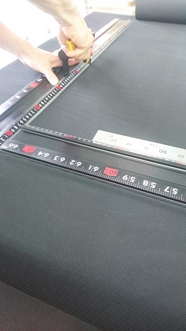 今回の作業は、長さが5Mほどなので作業台の上で一回でひろげられないので、数回に分けてカットします。