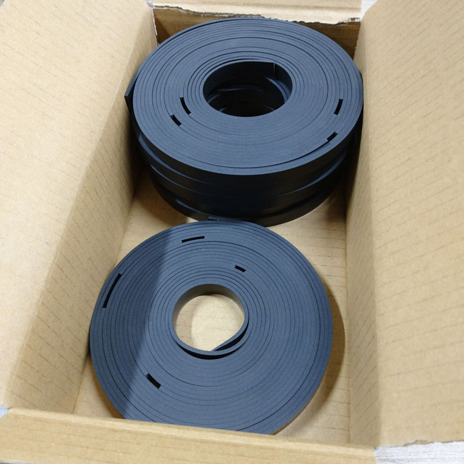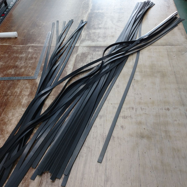 10mm幅の紐状にカットしたゴムシートの事例です。お客様が現場で小さすぎる寸法を手切りで大量に切り出すのは時間と労力が必要です。意外と難しいのです。私たちはこのサイズだと機械を使ってカットしています。長さ2000mm以内でご依頼いただくと、より正確な寸法が出しやすいです。
