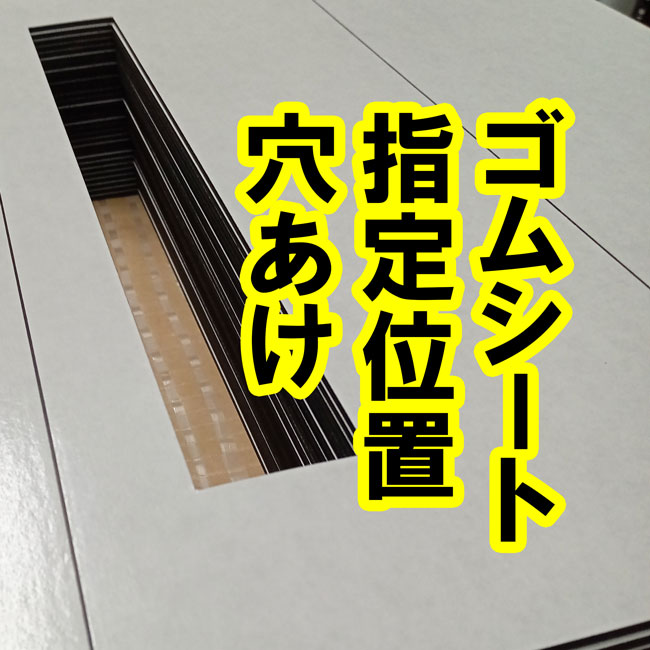 ▽ 詳細な寸法は掲載できませんが、このようにご指定位置に穴をあけるお仕事をたくさんいただきます。白く見えるのは両面テープです。3枚を継ぎ貼りしています。