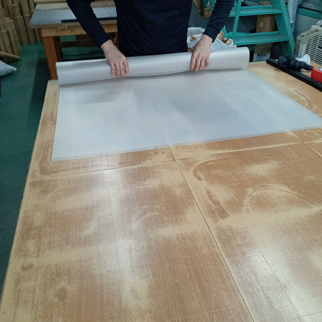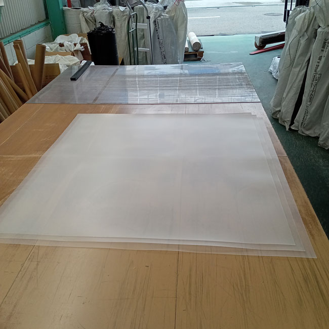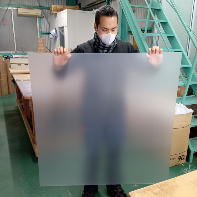 ▽ 塩ビ板3枚を作業台に重ねて置きました。ギリギリ作業台が見える程度の透過率です。