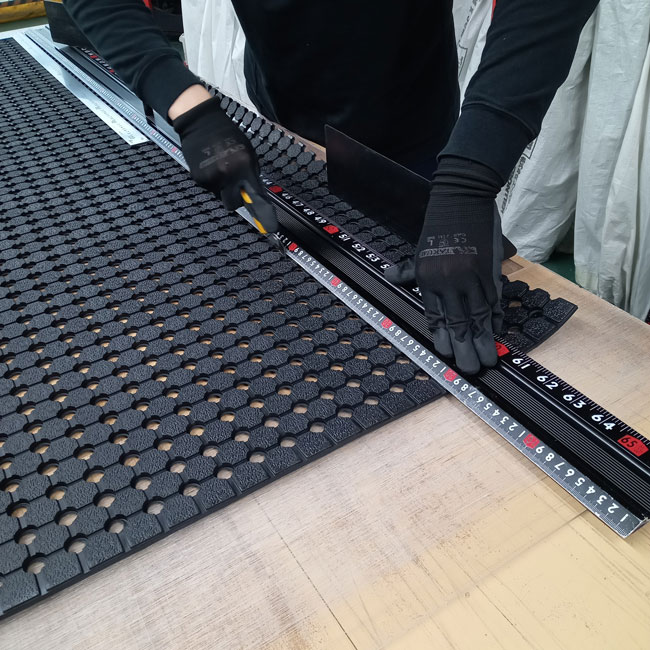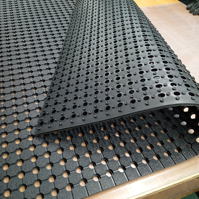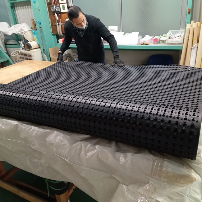 全面穴あきゴムシートは未舗装の駐車場に最適です。ゴムの表面に雨水が溜まらないため清潔感を維持でき、滑りにくいです。また、裏側に突起があるため水や空気が抜けやすく、敷きっ放しでも土壌を痛めにくいにも特徴です。観光農園の駐車場などでも多く使われています。