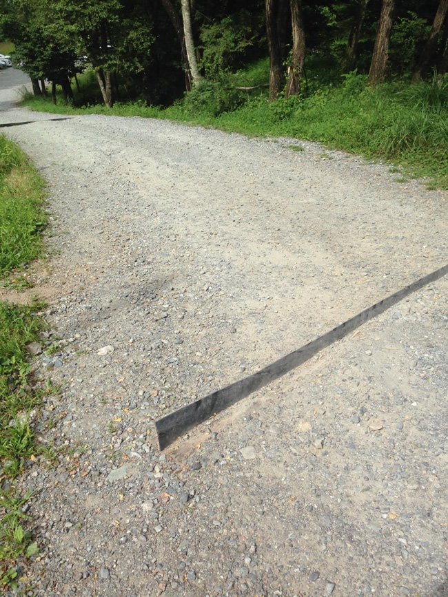 今回は林道や森林作業道など、車やバイクが行き来する山中の道路が、雨水によってデコボコになってしまうことを防ぐ「横断排水溝」を作るために特化した【横断排水溝専用ゴム板】のご紹介です。