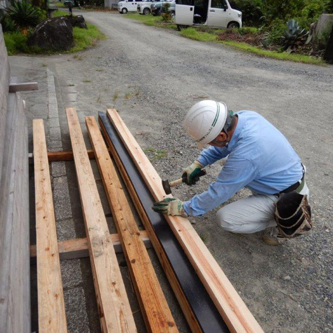 基礎となる木材にゴム板を打ち付けて準備をしている様子です。