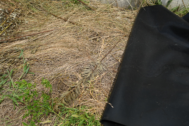 ゴムシートは水を通さず日光で熱を持つので、上に草を置けば乾きやすく根付く心配もありません。草を抜いてそのまま捨てると、わりとかさばって大変です。乾かせば、肥料として利用するにしても、廃棄するにしても良いのです。