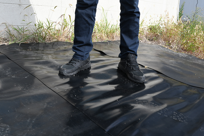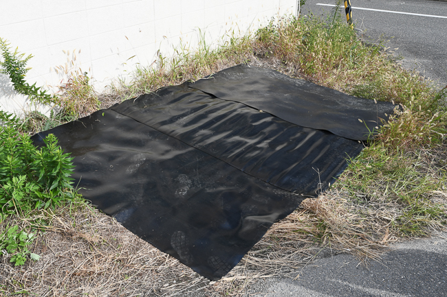 ゴムシートは日光を完全に遮断します。雑草は、日光を遮断すると枯れるしかありません。さらに、雨が降っても水を通さないので、除草中には日光と雨水を遮断し、さらに日光の熱で地表の温度を上げて、雑草が枯れやすい状況をつくりだします。