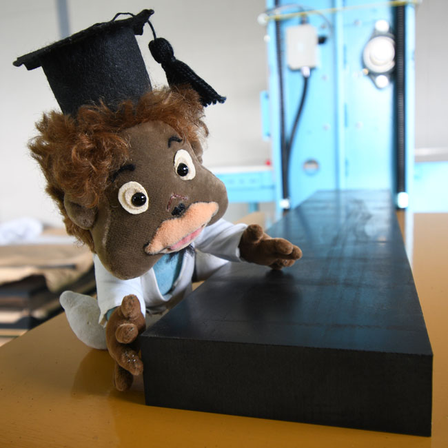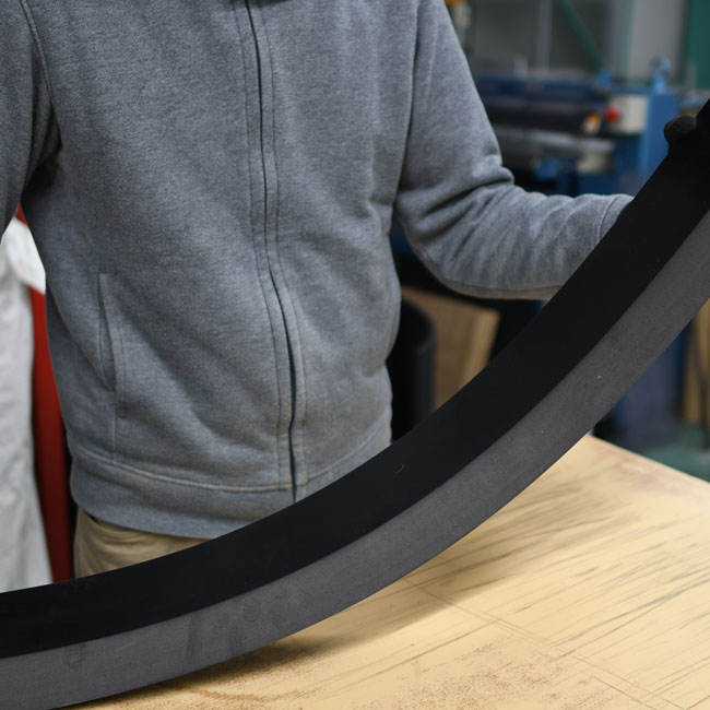 ▽ 50mm厚×100mm×1000mmのゴムを少し曲げてみました。ゴムですので曲がりますが、10mm以下と比べてかなりの力を要します。
