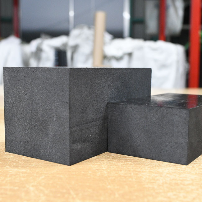 現在、ゴムシート.comでは最大厚50mmのゴムまで在庫しています。複雑なカットはできないのですが、縦横のサイズをご指定いただければ、角型(正方形や長方形)のカットは自社の裁断機ですぐにできます。この厚みになるとゴムシートではなく、ゴムブロックやゴム角棒にして、嵩上げや段差解消に使っていただくことが多いです。