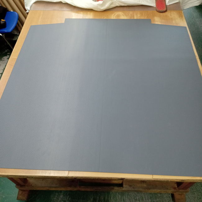 エレベーターマットを指定形状にカットするお仕事をたくさんいただきます。エレベーターの形状はメーカーや品番によって様々だと思いますので、手書きで形状と寸法を送っていただきましたら、その形状に合わせてカットして納品いたします。ほとんどの場合は1枚もので規格がないことが多いですが、こちらでどの部分で分割するかなどもご提案させていただきます。