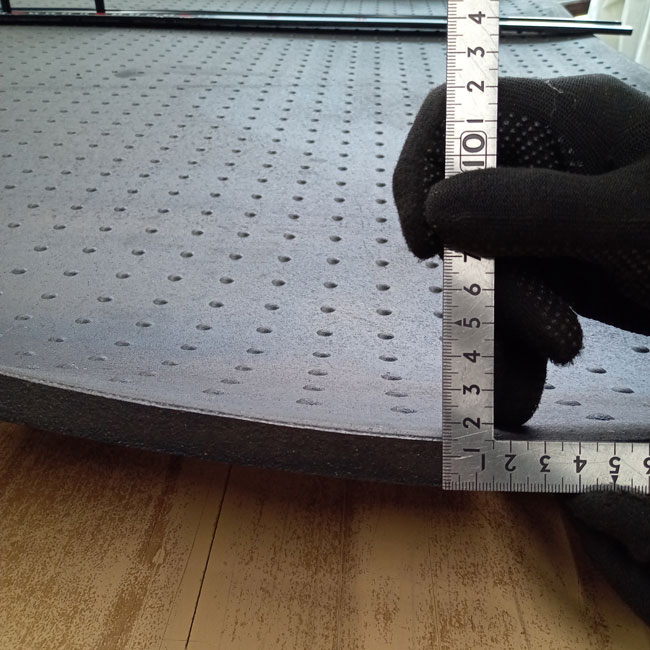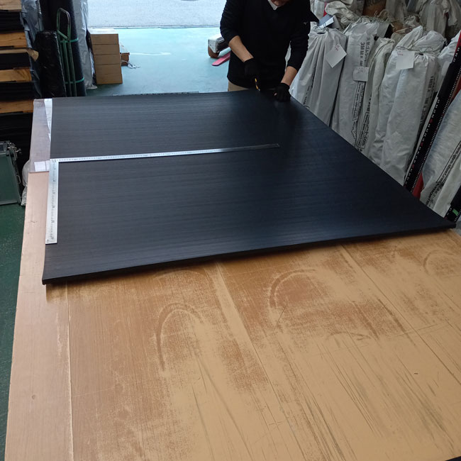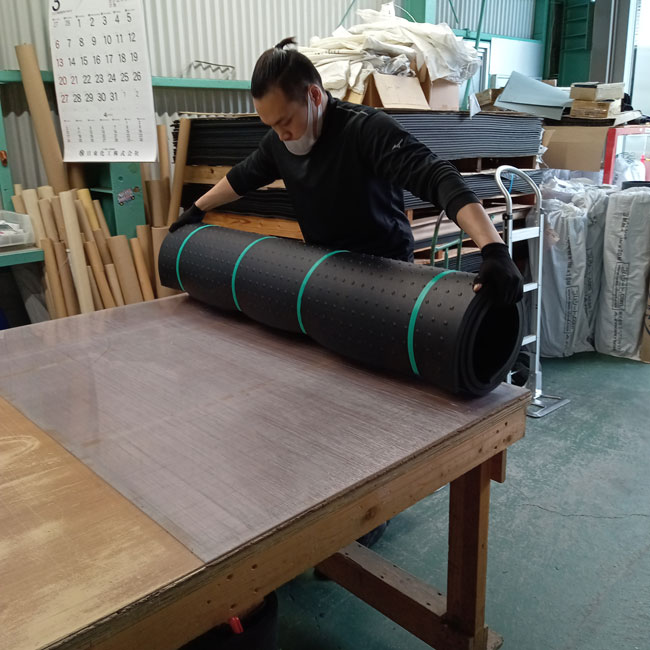 リサイクルゴムは長さ選択の項目がありませんが、御見積フォームからご指定の寸法でご依頼いただけます。今日の記事は15mm×1400×2000からご指定の寸法にカットした事例をご紹介します。今回は手切り(カッターナイフ)で仕上げています。