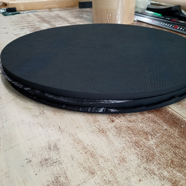 小さな円から大きな円までご指定の直径で円形のゴムシートを製作できます。絶対に円形でないとダメな場所、角形でも目的は果たせるが、円形にした方が見栄えが良い場所があるかと思います。直径1M弱まで製作可能です。