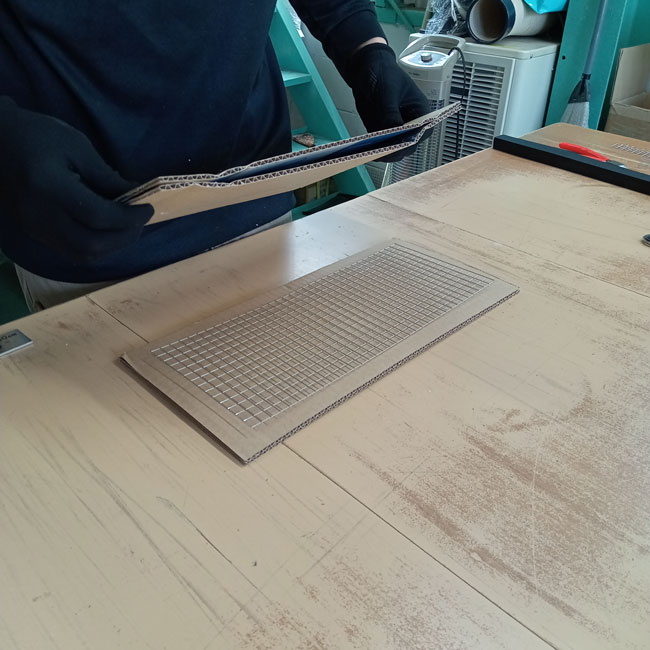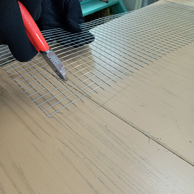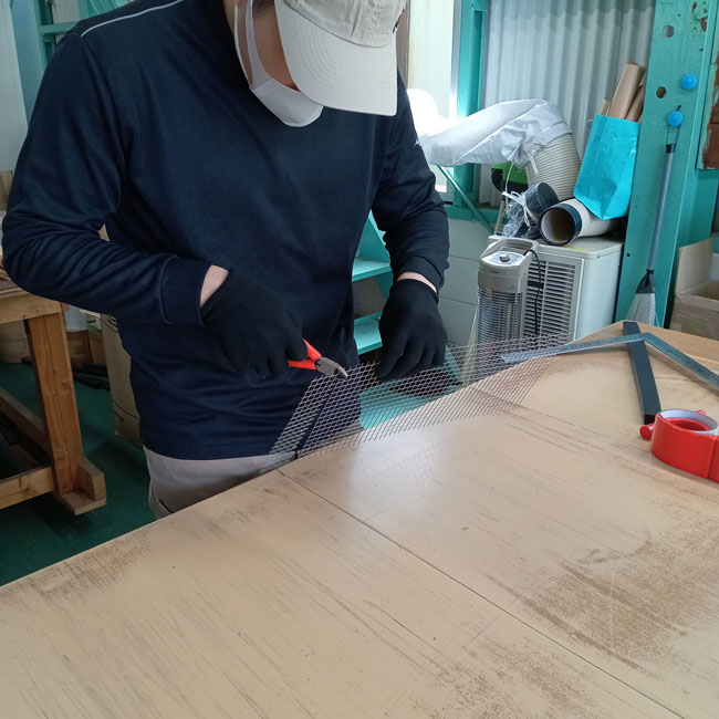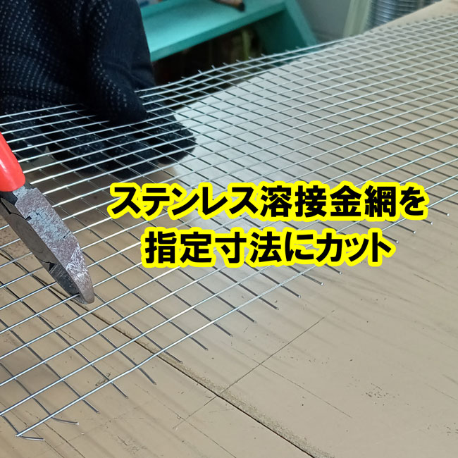 ゴムを切る機械はありますが、金網を切る機械がありませんため、すべて手持ちの工具で切断しています。数種類のニッパーや番線カッターを常備して線径の太さに合わせて使い分けています。1本ずつプチンプチンと切断していくのは大変なのですが、仕上がりは比較的美しいです。例えば、線の突き出しを極力なくすなどのご要望にもお応えできます。金網切断によく使われるシャーリングはよく切れますし早いですが、どうしてもラフな仕上がりになりやすいのです。