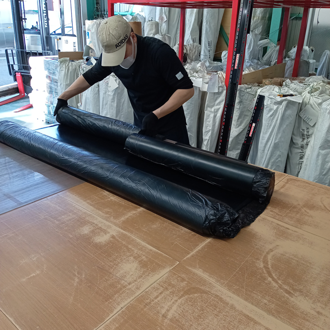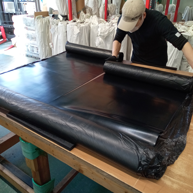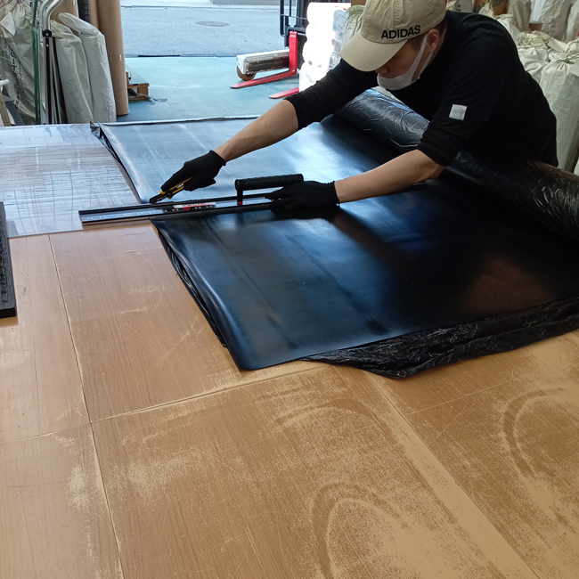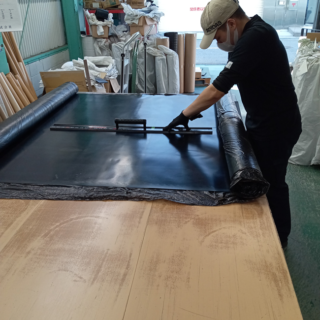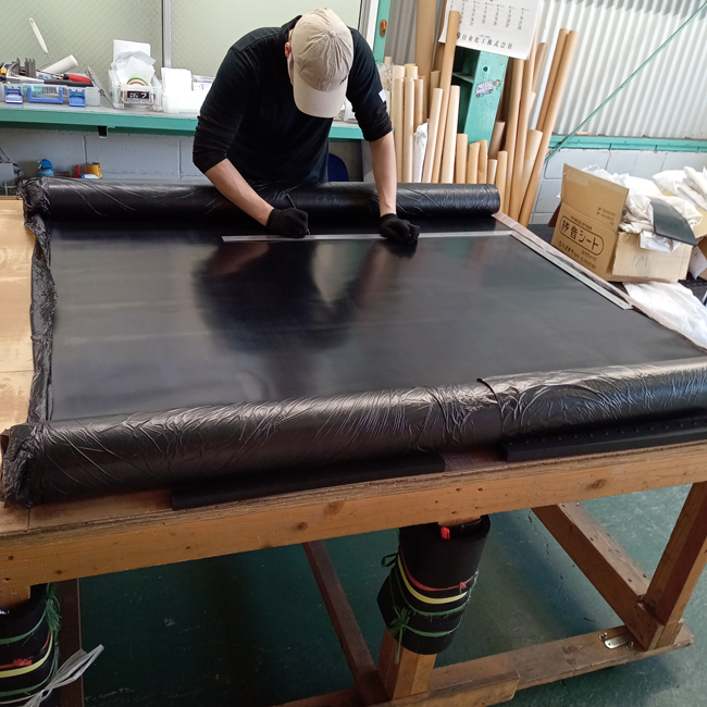 慣れない作業だと思いますので、できるだけ広いスペースでやった方がやりやすいです。狭いと伸ばして巻いて動かして、の動作が多くなるので労力がかかります。少しの動作かもしれまさえんが、重いゴムシートを動かすのは思っておられるよりも大変な場合が多いです。