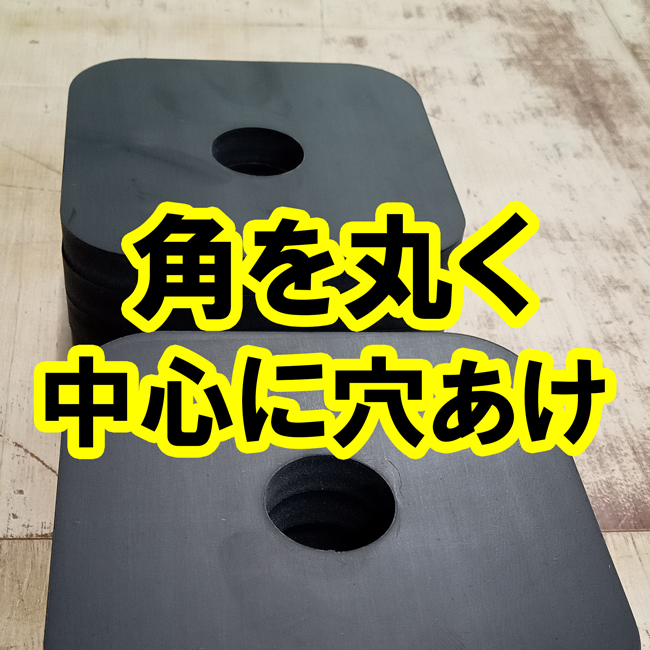ゴムシートの角を丸く(R加工)して、中心に穴あけもできます。ゴムの部材をぴったりとはめ合わせるために、角を丸くして指定位置に穴をあけるご依頼をたくさんいただきます。部材によって寸法は様々ですが、10mm以内で特別に大きなものでない限りは短納期で製作可能です。1枚から承ります。例えば、10サイズ各1枚のご注文でも可能です。