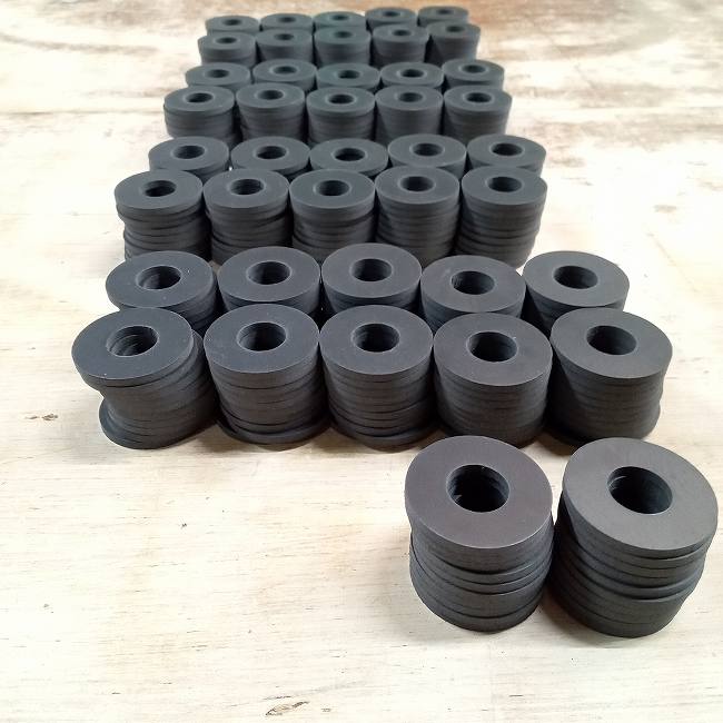円形のゴムパッキン製作のご依頼は非常に多いです。1枚から数千枚まで様々なご注文をいただいております。工事中に劣化しているパッキンが見つかったので1枚だけ明日届けてもらいたい、製品部材として検討しているので数百枚をいついつまでに届けてもらいたい、などお客様のご希望に出来る限りお応えいたします。