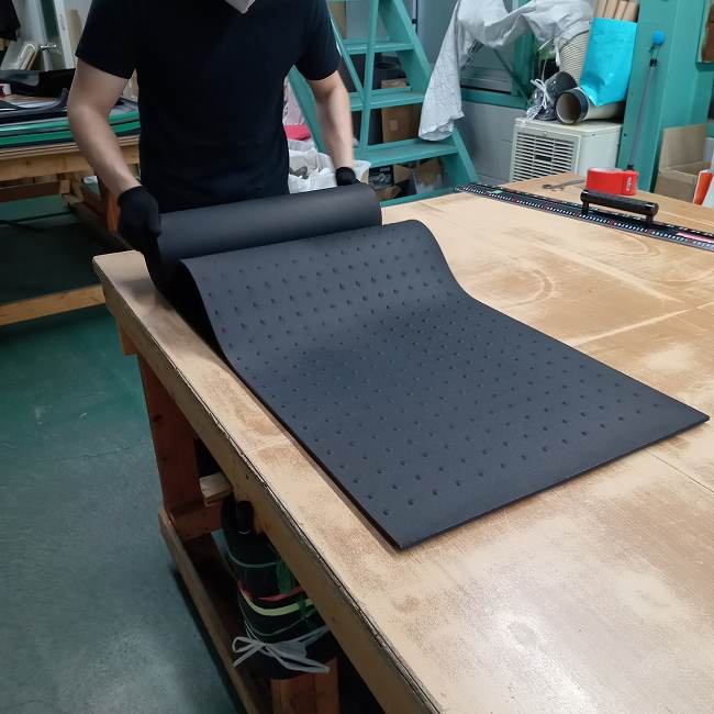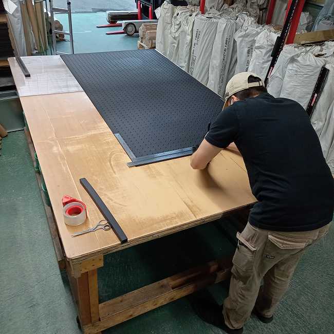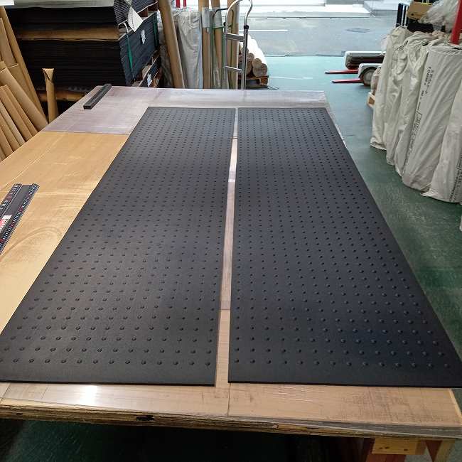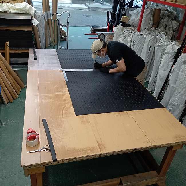 ゴムは気候の変化で伸縮します。厚くなると伸び、寒くなると縮みます。寸法が大きければ大きいほど、その伸縮度合は大きくなります。ですので、上のように950mm×1950mmでカットしてもその通りの寸法が維持されるわけではないのです。気候の変化以外にも巻くだけでもゴムにテンションがかかりますので、広げたときに寸法が変わっていることが多いです。