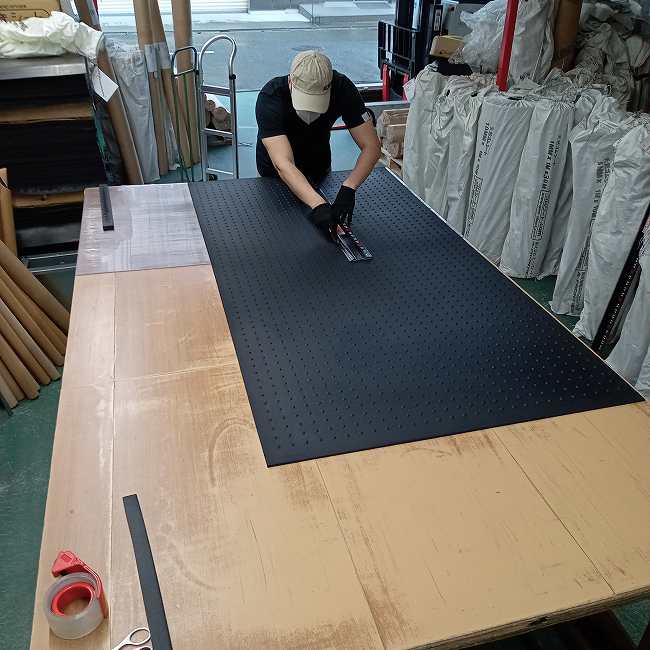 リサイクルゴム1M×2Mを0.5M×2Mにカットする様子をご紹介します。前回の記事同様に使うのは定規とカッターナイフだけです。ただし、今回の幅カットは直線距離2Mを切断するため、油断すると寸法が大きくずれてしまいます。