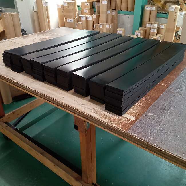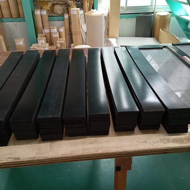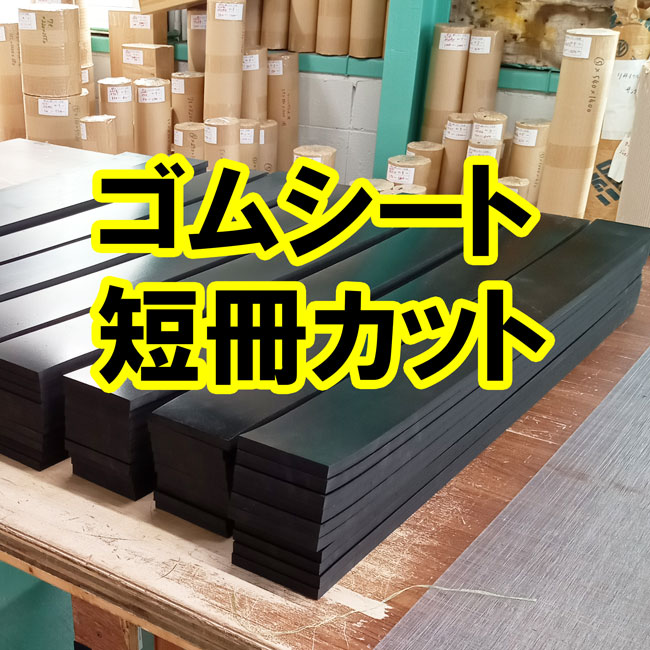 ゴムシートの短冊カット(細長く切る)のご依頼が多いです。ガラスを運搬するポニーに貼り付けて使っていただくことが多く、ポニー本体の木材の幅に合わせてゴムをカットさせていただきます。屋外で使用されるので本来は合成ゴムがオススメですが、コスト重視で天然ゴムをお使いになるケースが多いです。多少の劣化は運搬に支障はないということだと思います。