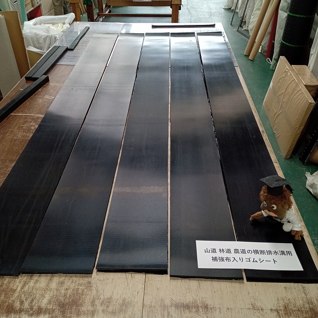 山林、森林の作業道の保全、維持にゴムを埋め込む工事がされています。止水と排水を同時にでき、路面の流水を止めることで路面を保護するのです。作業車が通りますので、通常のゴム板ではなく、柔軟性と耐久性を兼ね備えた補強布入りゴムが最適な材質です。