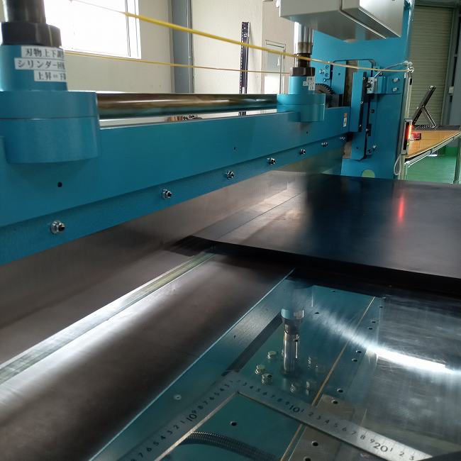 ▽ このような大型の裁断機で切断します。パワーがあるのでほぼ垂直にスパッと切れます。