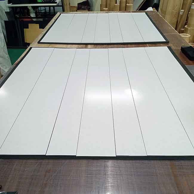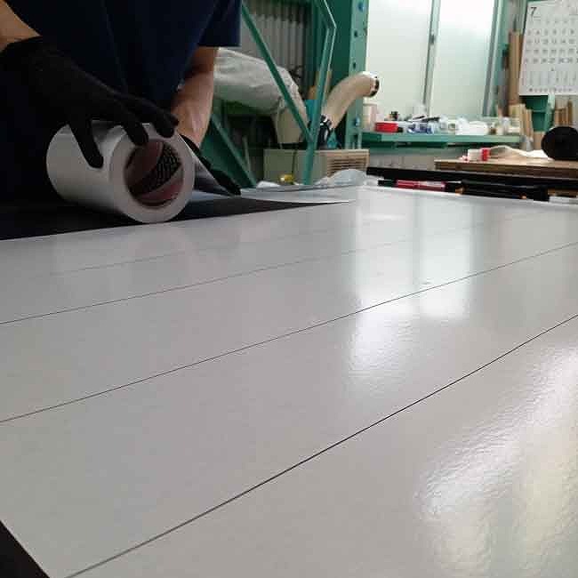 ▽ 隙間なく全面に貼り付けました。このあと、図面通りにカットすることで全面にテープが付いた状態で納品でできます。