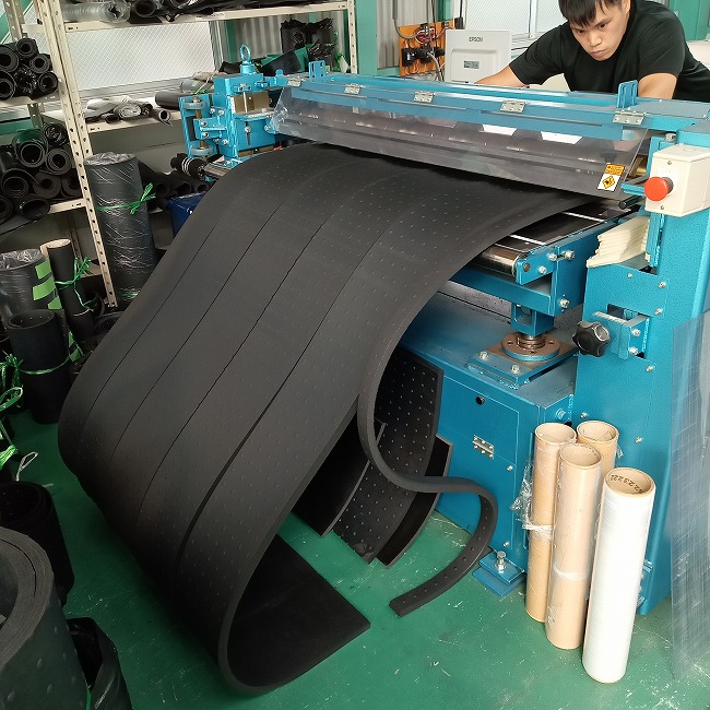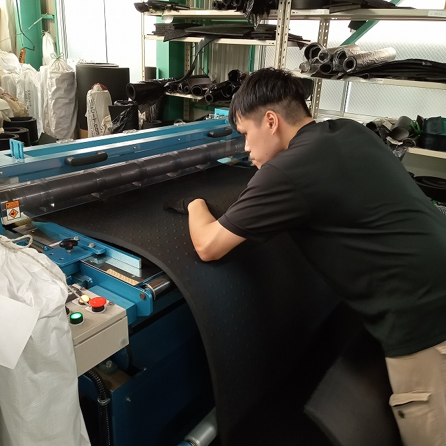 ゴムシート.comは即納を強みにしていますが、手作業では限界があるため機械を使いながら段取りを組んでいます。例えば、同じ幅カットが大量にある場合は複数枚を一気に切断できる専用機械があります。完全オートではないですが、それが逆に小回りが利いて即納に貢献しています。