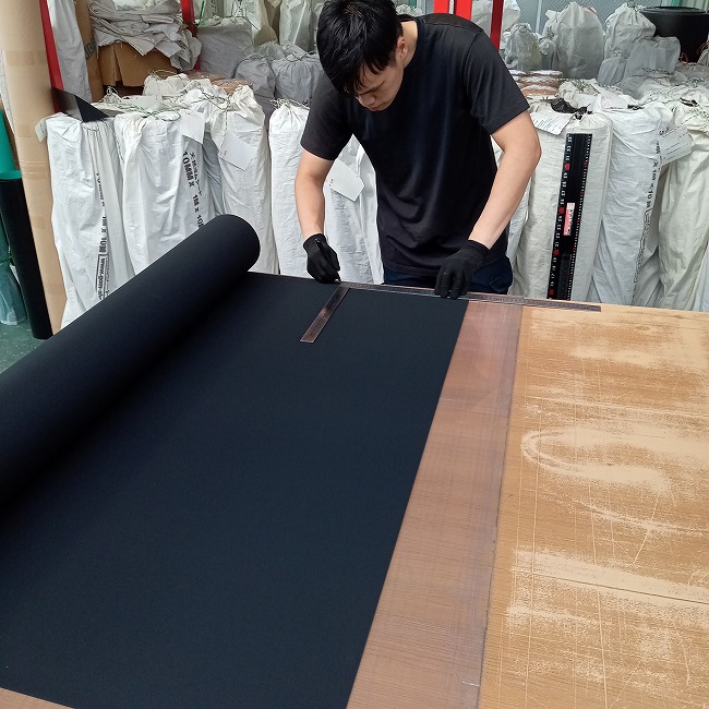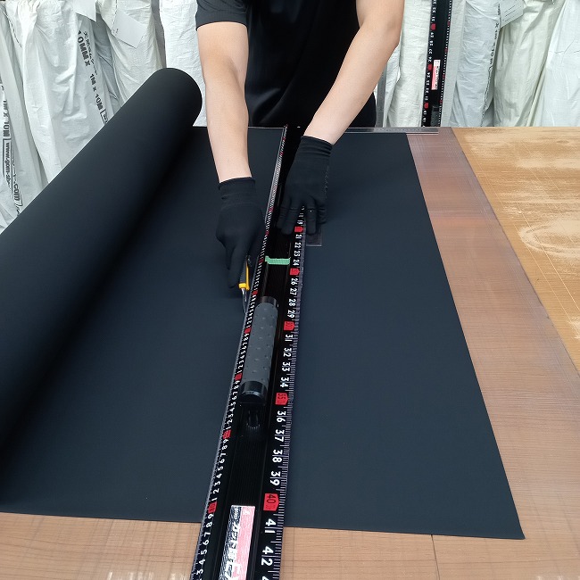 ゴムシートは滑り止めの目的に敷いていただくことが多いです。ほとんどのゴムで滑り止め効果はあるのですが、表面がザラザラしているエンボスタイプは滑り止め効果が高いです。ゴムの臭いがほとんどしないので小さくカットして什器やスタンドの滑り止めにも使いやすい製品です。
