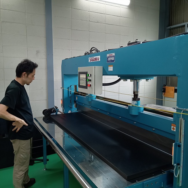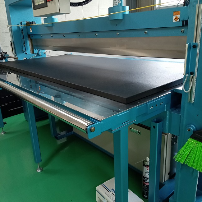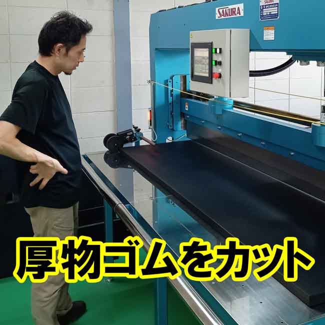 厚いゴムは専用の裁断機を使ってカットしています。刃が垂直に降りるタイプの裁断機ですので、複雑なカットができるわけではありませんが、ご指定の縦横寸法にカットするのはこの裁断機がないと困難です。