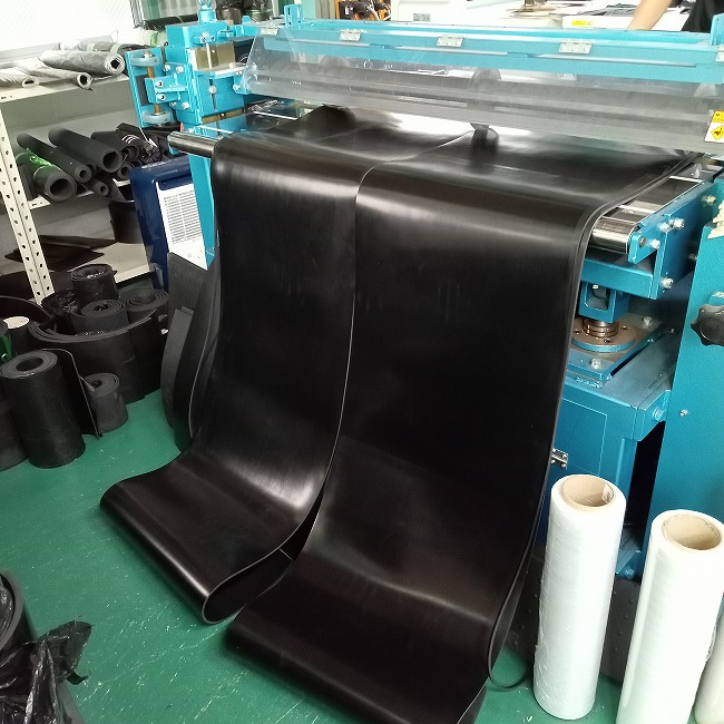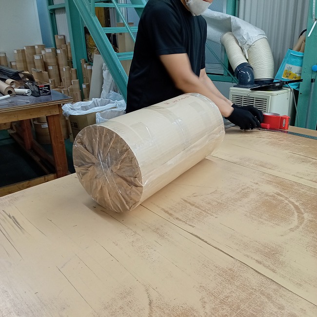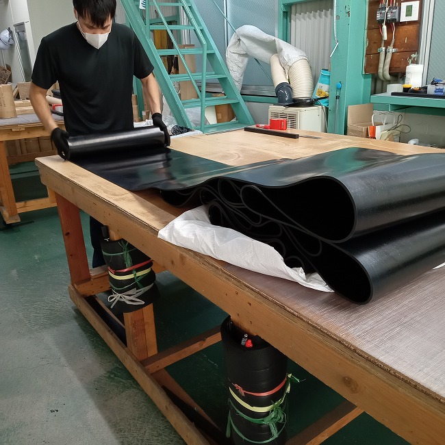 長尺のゴムシートの幅カットも可能です。例えば、1M×10M 1本を0.3M×10M 3本にできます。1/3に切るだけの作業なのですが、10Mを真っすぐ切るのは想像以上の時間と労力が必要です。がんばっても1時間以上はかかります。カットのご依頼をいただくと、切った状態でお届けしますので、すぐに使えて便利です。