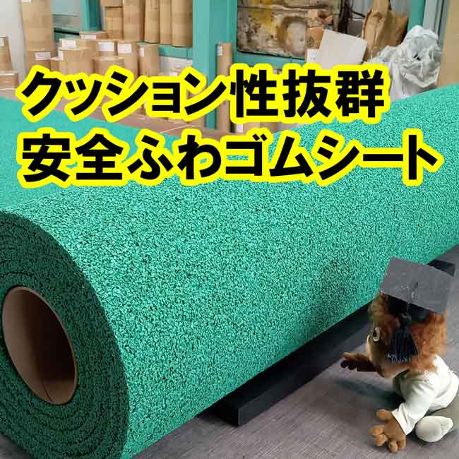 ふわっと衝撃吸収、安全ふわゴムシートの販売を開始しました。ゴムチップを固めてシートにしているため、全体にわずかな隙間がありクッション性抜群です。またそのわずかな隙間が水や空気を通すので、水が溜まらず乾きやすく快適な状態を保ってくれます。