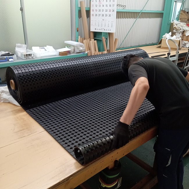 ゴムシート.comでは多くのゴムシートを在庫し、カット販売しています。その中でも穴あきゴム1.8M×10Mはトップ級に巨大です。このサイズをカットするのは困難で重量があるため危険のないように充分な注意をして作業しています。