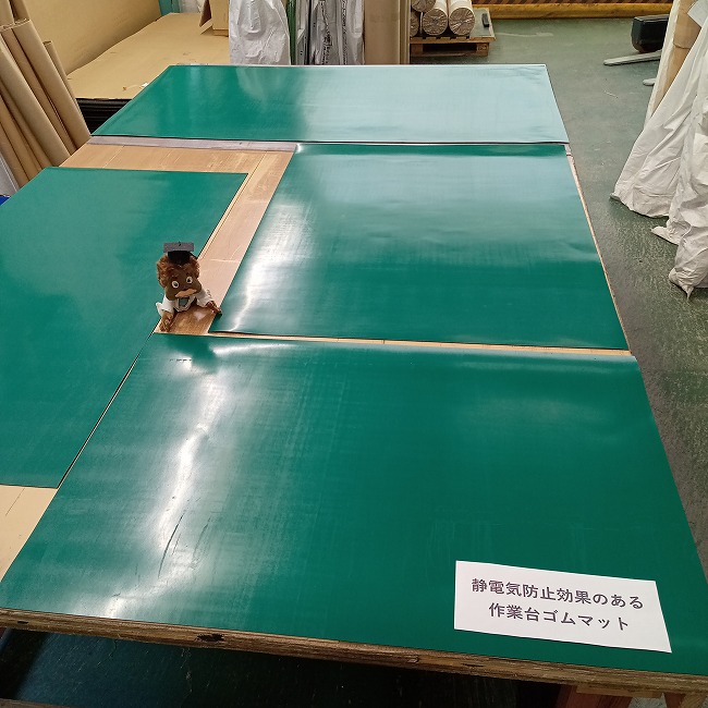 作業台にオススメしているゴムマットをご紹介いたします。わずかに静電気防止効果があり、表面にゴミや埃がついても拭き取りやすい商品です。静電気の発生を厳密に管理される作業では適していませんが、DIYや木工作業時には通常のゴムより使いやすいかと思います。