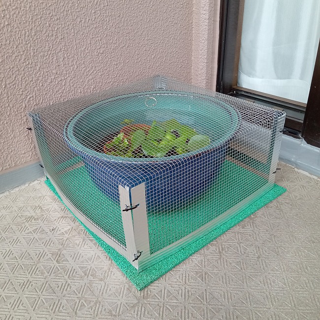 実は金網も自作です。トンボがビオトープに産卵するのを防ぐための金網です。トンボの幼虫であるヤゴは肉食でメダカを捕食します。いったん産卵されると数匹ではなく相当数のヤゴが発生しますので大変です。そのため、産卵しないようにすることが大切なのです。